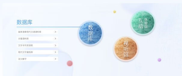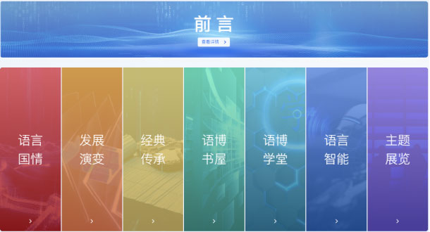 根據(jù)語言文字特點(diǎn)及其文化特征,語博一期建設(shè)分為語言國情、發(fā)展演變、經(jīng)典傳承、語博書屋、語博學(xué)堂、語言智能、主題展覽7個主體版塊,以及數(shù)據(jù)庫、視聽館、互動體驗館3個資源模塊,橫縱交叉、立體展示。