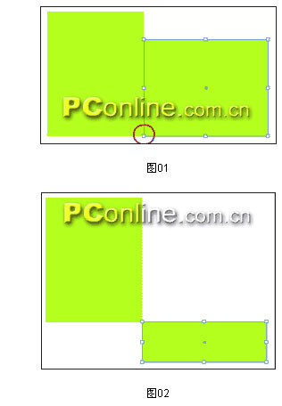 2.選擇旋轉(zhuǎn)工具,按住Alt單擊矩形的右下角,定位變化中心點(diǎn),在出現(xiàn)的對(duì)話框中,角度為-90,點(diǎn)擊“復(fù)制”(圖01);將這個(gè)復(fù)制的矩形垂直向下移動(dòng),直到這個(gè)矩形的上邊緣和原始矩形的下邊緣對(duì)齊;用直接選擇工具選擇這個(gè)復(fù)制矩形,拖移下邊框,將它收縮到合適尺寸(圖02)。這作為包裝盒的側(cè)面。