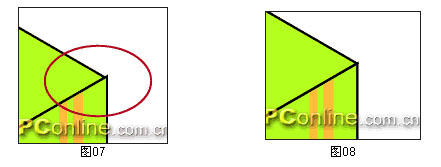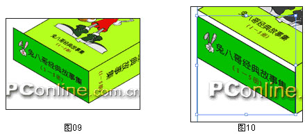 7.上面這張圖是經(jīng)過縮小的,如果把它放大,我們會(huì)發(fā)現(xiàn),在接角處有一部分多余(圖07),我們來想辦法消除它。選擇自由變換工具,按住Shift,拖動(dòng)選取框最上面的點(diǎn),使它的垂直邊緣與包裝盒上面的右外側(cè)對(duì)齊。由于差距很小,所以經(jīng)過這樣的改動(dòng),多余的地方基本上已經(jīng)看不見了(圖08),如果你還不滿足,想要更精密的結(jié)果,下面我會(huì)給出方法。