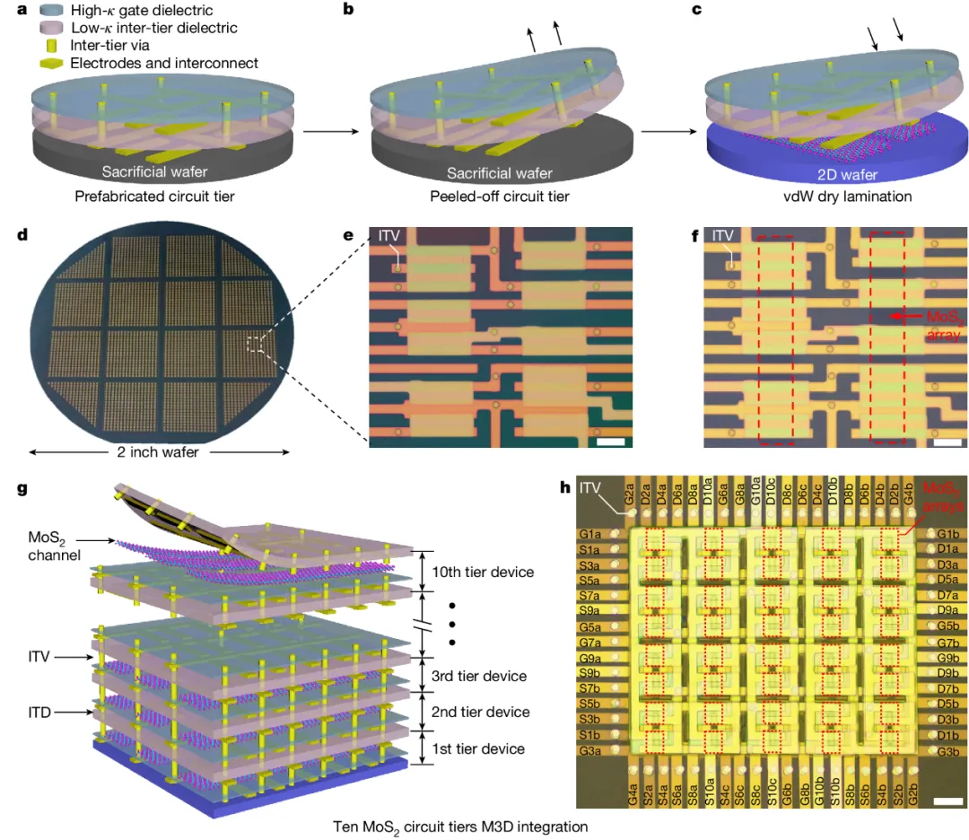近日,湖南大學物理與微電子科學學院劉淵教授團隊報道了一種低溫的范德華單芯片三維集成工藝。在該工藝中,源/漏/柵電極、層內(nèi)互連金屬、高κ柵介電質(zhì)、低κ層間介電層和層間垂直通孔等電路功能層首先預制備在犧牲晶圓上,之后在120 °C的低溫下范德華集成到半導體晶圓上。通過逐層集成范德華預制備電路層和半導體層,團隊實現(xiàn)了10層的全范德華單芯片三維系統(tǒng)。同時,團隊發(fā)現(xiàn)范德華集成工藝不會對底部的硫化鉬晶體管電學性能產(chǎn)生影響,能夠保證晶體管的本征性能。進一步集成不同功能的電路層,團隊實現(xiàn)了邏輯、傳感和存儲互聯(lián)的三維異質(zhì)集成和協(xié)同工作。