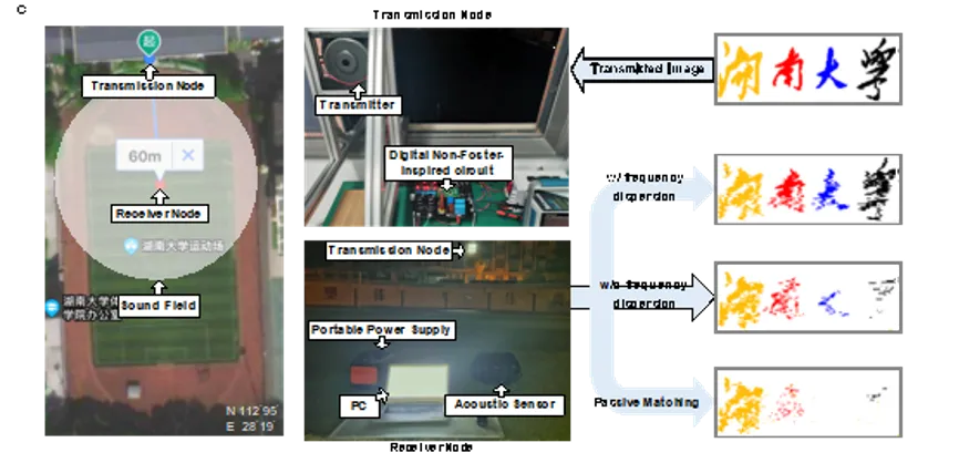 實驗證明所提出的數(shù)字非福斯特電路能夠在遠距離圖像傳輸?shù)倪^程中提供穩(wěn)定的,具有頻散效應的實時等效負阻抗特性,并且與模擬非福斯特匹配網(wǎng)絡對比,將電聲發(fā)射裝置的工作帶寬提高了五倍以上,功率處理能力提高了三個數(shù)量級以上。其原理和方法可被廣泛應用于各類亞波長共振系統(tǒng)裝備,包括電聲發(fā)射,電磁天線,寬帶超材料等,具有重要的工程應用價值。