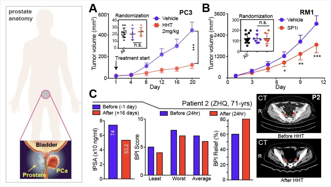 該工作從臨床樣本出發(fā),鑒定了一種新的惡性PCa亞型,并通過多種體內(nèi)外試驗證明靶向蛋白質(zhì)合成通路和SP1可有效地抑制腫瘤進展。尤其是作者開展了IIT臨床研究,初步證明了HTT治療惡性PCa的可行性,為后續(xù)的臨床轉(zhuǎn)化提供了直接的依據(jù)。