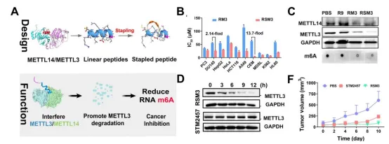 甲基腺嘌呤修飾與多種腫瘤的發(fā)生發(fā)展密切相關。作為參與修飾最重要的甲基轉(zhuǎn)移酶—METTL3,已成為治療癌癥等疾病的潛在治療靶標,受到學界和業(yè)界的密切關注。該研究基于METTL3-METTL14蛋白結(jié)構(gòu),設計了靶向METTL3的多肽抑制劑RM3。進一步優(yōu)化獲得更高活性的訂書肽抑制劑RSM3,該多肽具有廣譜的抑癌特性,能夠殺傷多種METTL3高表達的腫瘤細胞。同時在多種腫瘤模型中,RSM3顯示出優(yōu)異的抗腫瘤效果。