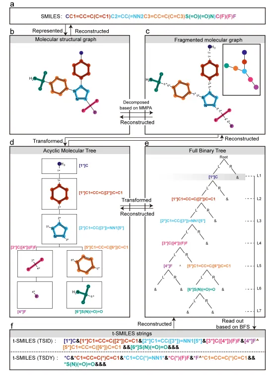 近日,湖南大學化學化工學院俞汝勤院士團隊在分子表征的研究中取得新進展。該研究介紹了一種可擴展的、基于片段的多尺度分子表示框架,稱為 t-SMILES(基于樹的 SMILES),包括三種編碼算法:TSSA、TSDY和TSID。t-SMILES系統(tǒng)僅引入了兩個不需要配對的新符號,給1988年發(fā)表的最經(jīng)典分子線性表示法SMILES引入了片段結(jié)構(gòu)信息,同時縮短了SMILES描述符中由于需要配對的括號和數(shù)字所帶來的長期依賴問題,并因其語法的簡單性使得t-SMILES非常易于學習。該研究關注自然語言處理模型協(xié)助化學家進行分子空間探索時面臨的最核心也是最基礎的如何編碼分子的問題,為AI輔助的分子建模提供了新的研究思路,助力分子“智造”。相關研究成果發(fā)表在Nature Communications上。