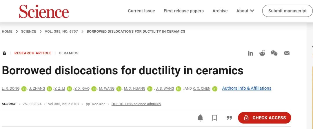 2024年7月26日,國際頂級期刊《科學(xué)》(Science)刊發(fā)了北京科技大學(xué)新金屬材料國家重點(diǎn)實(shí)驗(yàn)室陳克新研究員團(tuán)隊(duì)聯(lián)合北京工業(yè)大學(xué)王金淑教授團(tuán)隊(duì)以及香港大學(xué)黃明欣教授的最新科研成果《借位錯實(shí)現(xiàn)陶瓷拉伸塑性變形》(Borrowed dislocations for ductility in ceramics)。該項(xiàng)研究成果在世界上首次實(shí)現(xiàn)陶瓷的室溫大變形拉伸塑性,標(biāo)志著學(xué)校在結(jié)構(gòu)陶瓷領(lǐng)域取得重要進(jìn)展,北京科技大學(xué)為該論文的第一通訊作者單位。
