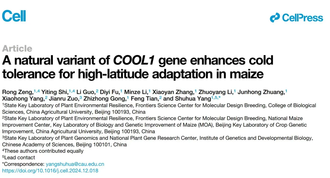 近日,中國農業(yè)大學生物學院植物抗逆高效全國重點實驗室楊淑華課題組在Cell雜志在線發(fā)表了題為A natural variant of COOL1 gene enhances cold tolerance for high latitude adaptation in maize的研究論文。該研究首次揭示了玉米適應高緯度低溫環(huán)境的分子機制,發(fā)現玉米COOL1基因的自然變異通過增強低溫耐受性,促進其適應高緯度環(huán)境。這一發(fā)現彌補了關于玉米適應高緯度低溫環(huán)境的知識空白,并為高緯度地區(qū)玉米的種植提供了新的分子育種策略。