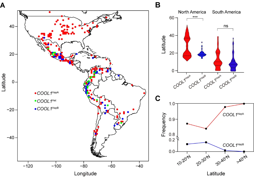 為了探究COOL1基因的進化起源,研究團隊對59種不同大芻草中COOL1啟動子區(qū)域進行了測序。結果顯示,超過一半的大芻草攜帶耐冷等位基因COOL1HapA,表明這一等位變異在野生種群體中就已存在。進一步對1,008份前哥倫布時期遍布美洲大陸的玉米地方品種進行基因分型,發(fā)現COOL1HapA耐冷等位基因主要分布于北部高緯度寒冷地區(qū),并在北美地區(qū)固定,而COOL1HapB冷敏感等位基因則更常見于低緯度溫暖地區(qū)。這表明,COOL1的耐冷等位基因在促進玉米適應高緯度低溫氣候過程中起到了重要作用(圖2)。研究還指出,我國一些主栽玉米品種(如先玉335、鄭單958等)的部分親本攜帶COOL1冷敏感等位基因。值得一提的是,在正常環(huán)境條件下,COOL1功能缺失突變體的產量相關性狀并未表現出顯著變化。因此,COOL1耐冷等位基因在提升玉米耐冷性、拓展其高緯度種植范圍方面具有顯著的應用潛力。