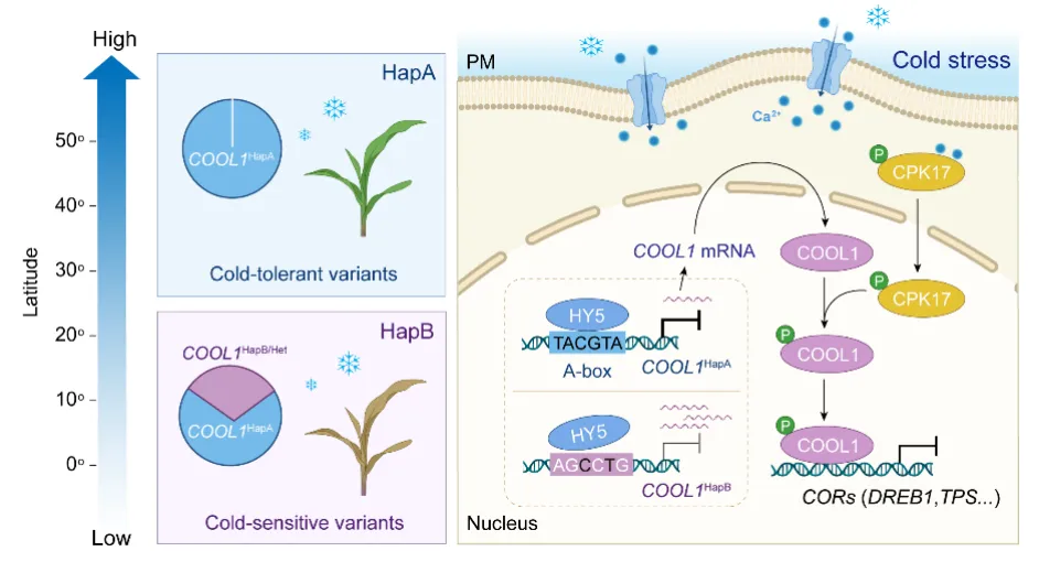 進一步研究發(fā)現,COOL1啟動子區(qū)的4個顯著自然變異位點位于A-box基序,這一基序受光信號關鍵轉錄因子HY5的調控。在低溫環(huán)境下,HY5表達水平顯著上升,通過抑制COOL1基因的表達,正向調控玉米的耐冷性。COOL1啟動子的自然變異影響了HY5對其啟動子區(qū)的結合能力,從而導致了COOL1HapA和COOL1HapB耐冷性差異。進一步研究還表明,COOL1的蛋白穩(wěn)定性受到鈣依賴蛋白激酶CPK17的調控。低溫激活CPK17激酶活性,促使其從細胞質進入細胞核,磷酸化COOL1,從而增強COOL1蛋白穩(wěn)定性,負向調控玉米的耐冷性。