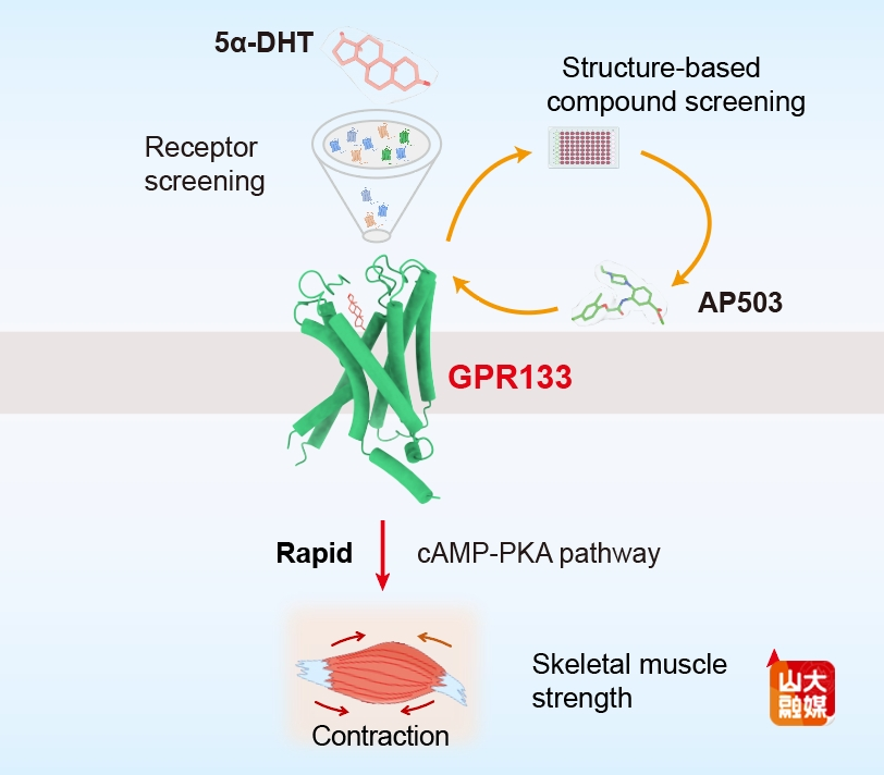 1月30日,山東大學(xué)基礎(chǔ)醫(yī)學(xué)院孫金鵬教授團(tuán)隊(duì),聯(lián)合德國(guó)萊比錫大學(xué)Ines Liebscher教授團(tuán)隊(duì),山東大學(xué)易凡教授團(tuán)隊(duì)、肖鵬教授團(tuán)隊(duì)和于曉教授團(tuán)隊(duì),在《細(xì)胞》(Cell)在線發(fā)表了研究論文“Identification, structure and agonist design of an androgen membrane receptor”。研究團(tuán)隊(duì)篩選鑒定了雄激素5α-DHT的膜受體GPR133/ADGRD1,闡明了其在骨骼肌中的調(diào)控作用及分子機(jī)制,并發(fā)展了特異性GPR133的小分子配體,為高效安全的雄激素替代藥物開(kāi)發(fā)提供了全新思路。