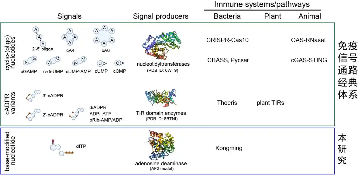在微觀世界里,細(xì)菌與病毒之間每天都在上演著攻防大戰(zhàn)。生物體內(nèi)的信號(hào)傳遞如同精密的通信網(wǎng)絡(luò),而核苷酸分子長(zhǎng)期被認(rèn)為是關(guān)鍵的“信號(hào)兵”。自1950年代發(fā)現(xiàn)環(huán)狀核苷酸(如cAMP、cGMP)以來,科學(xué)家已解析了其在代謝調(diào)節(jié)、免疫應(yīng)答中的核心作用,相關(guān)研究多次獲得諾貝爾獎(jiǎng)。不同于環(huán)狀核苷酸的免疫作用,非典型核苷酸在過去普通被認(rèn)為不發(fā)揮任何生理作用。然而,研究團(tuán)隊(duì)通過基因分析,鎖定了一個(gè)由KomA(孔明A)、KomB(孔明B)、KomC(孔明C)三個(gè)蛋白組成的防御系統(tǒng)。當(dāng)噬菌體入侵時(shí),其攜帶的脫氧核苷酸激酶(DNK)意外成為激活細(xì)菌免疫的“開關(guān)”:KomA與DNK協(xié)作,將核苷酸(dAMP)轉(zhuǎn)化為特殊信號(hào)分子dITP。這種分子能觸發(fā)KomC蛋白分解細(xì)胞內(nèi)的關(guān)鍵物質(zhì)NAD?,導(dǎo)致噬菌體因“能源枯竭”無法復(fù)制。令人稱奇的是,該系統(tǒng)巧妙利用入侵者攜帶的酶完成防御,正如三國(guó)時(shí)期諸葛亮“草船借箭”的智謀,因此被命名為“孔明系統(tǒng)”。這種堿基修飾核苷酸的信號(hào)傳導(dǎo)模式突破了環(huán)狀核苷酸作為信號(hào)分子的經(jīng)典理論體系,首次證實(shí)非典型核苷酸同樣具有免疫調(diào)控功能。