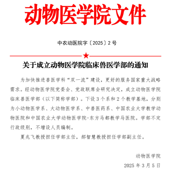 通知提到,為加快推進獸醫(yī)學科“雙一流”建設,更好的服務國家重大戰(zhàn)略需求。經(jīng)動物醫(yī)學院黨委會、黨政聯(lián)席會研究決定,成立動物醫(yī)學院臨床獸醫(yī)學部(以下簡稱學部)。下設3個系和2個教學基地,分別為小動物醫(yī)學系、大動物醫(yī)學系、中獸醫(yī)藥系、中國農(nóng)業(yè)大學教學動物醫(yī)院和中國農(nóng)業(yè)大學動物醫(yī)學院-東方馬都教學馬醫(yī)院。學部不定行政級別,不增設人員編制。夏兆飛教授擔任學部主任,郝智慧教授擔任學部副主任。