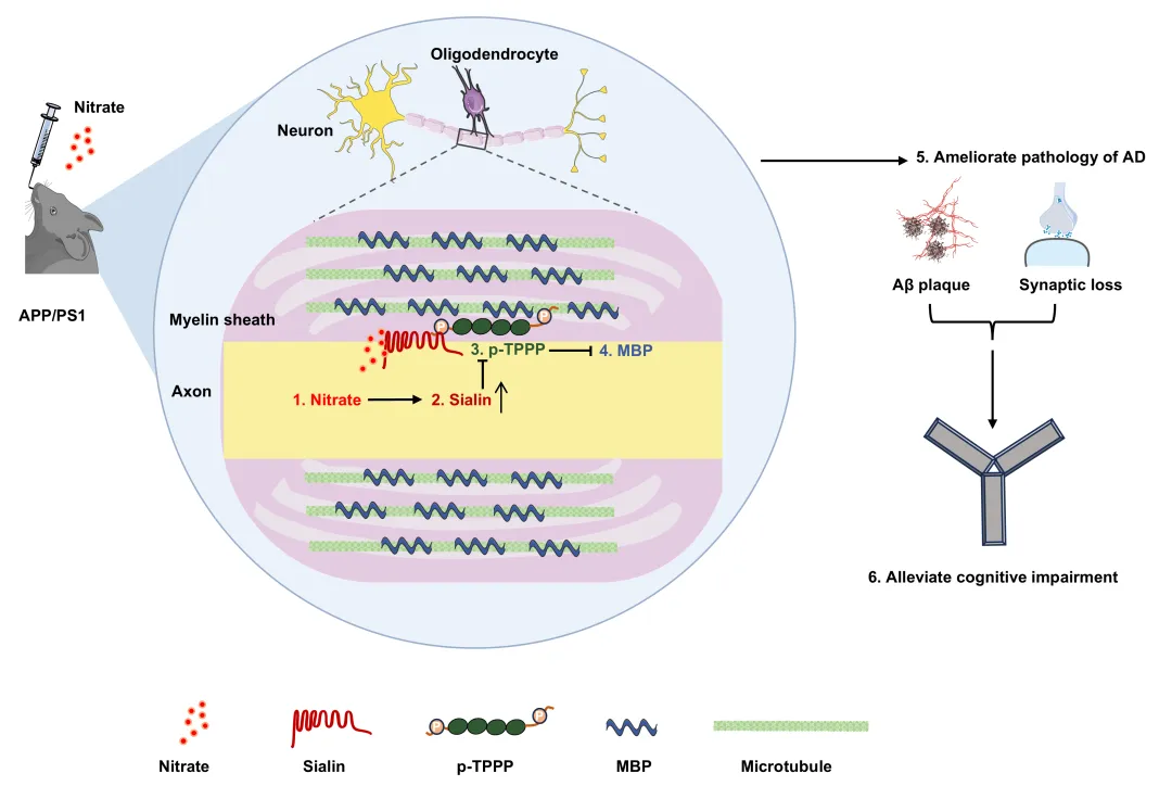上述研究揭示了硝酸鹽通過上調神經元Sialin,降低AD模型小鼠海馬TPPP的磷酸化,進而改善其髓鞘丟失并緩解AD病理和認知障礙,同時闡明Sialin與TPPP結合的具體位點,該研究為AD治療靶點和治療策略的開發(fā)提供重要理論依據(jù)。