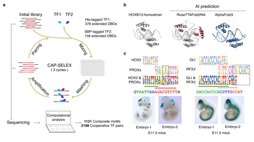 研究團隊借助于高通量篩選技術(shù)和計算生物學手段,對58000多種轉(zhuǎn)錄因子組合是否可協(xié)同結(jié)合DNA進行了系統(tǒng)性評估,鑒定出2198對協(xié)同作用的轉(zhuǎn)錄因子,并解析了協(xié)同作用轉(zhuǎn)錄因子識別的DNA基序(圖a)。進一步深入研究發(fā)現(xiàn),轉(zhuǎn)錄因子間的協(xié)同作用目前還不能被AlphaFold等人工智能工具所預測(圖b)。因而,研究提供的迄今為止最全面的轉(zhuǎn)錄因子協(xié)同作用數(shù)據(jù)庫,以及協(xié)同作用轉(zhuǎn)錄因子識別的DNA基序庫,為科學家們深入探索轉(zhuǎn)錄因子的各種生物學功能提供了重要的數(shù)據(jù)支撐和理論依據(jù)。