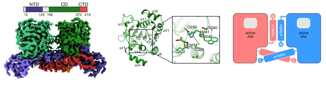 研究團隊成功表達(dá)并純化了具有活性的猴痘病毒核心蛋白酶,結(jié)合單顆粒冷凍電鏡和X射線晶體衍射技術(shù),解析了其高分辨率的三維結(jié)構(gòu)(圖1)。核心蛋白酶呈現(xiàn)出二體的組裝模式,每個單體包括N端結(jié)構(gòu)域(N-terminal domain, NTD),催化結(jié)構(gòu)域(catalytic domain, CD)和C端結(jié)構(gòu)域(C-terminal domain, CTD)?;钚灾行奈挥诖呋Y(jié)構(gòu)域,包含一個催化三聯(lián)體Cys328-His241-Asp258。猴痘病毒核心蛋白酶的二體相互作用模式與其他重要人類病毒的蛋白酶不同,是核心蛋白酶結(jié)構(gòu)穩(wěn)定和發(fā)揮催化功能的關(guān)鍵。