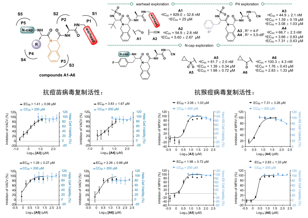 以核心蛋白酶的底物識別機制為基礎(chǔ),研究團隊設(shè)計合成了一系列擬肽類抑制劑,其中A3-A6具有高效的病毒核心蛋白酶抑制活性(IC50范圍:44.9 nM~100.3 nM),且表現(xiàn)出較強的抗猴痘病毒活性(EC50范圍:1.98 μM~7.31 μM)和抗痘苗病毒活性(EC50范圍:1.39 μM~3.66 μM),同時具有良好的安全性(CC50大于200 μM)。研究人員解析了抑制劑A3與核心蛋白酶的復(fù)合物結(jié)構(gòu),他們發(fā)現(xiàn)A3不僅可以與蛋白酶的催化中心的Cys328形成共價鍵,還可以利用其化學(xué)修飾基團同底物結(jié)合口袋的氨基酸殘基形成額外的氫鍵相互作用,以增強其結(jié)合能力。這些研究結(jié)果表明了化合物A3-A6在后續(xù)開發(fā)廣譜抗痘病毒抑制劑上的具有巨大潛力,是良好的先導(dǎo)化合物。