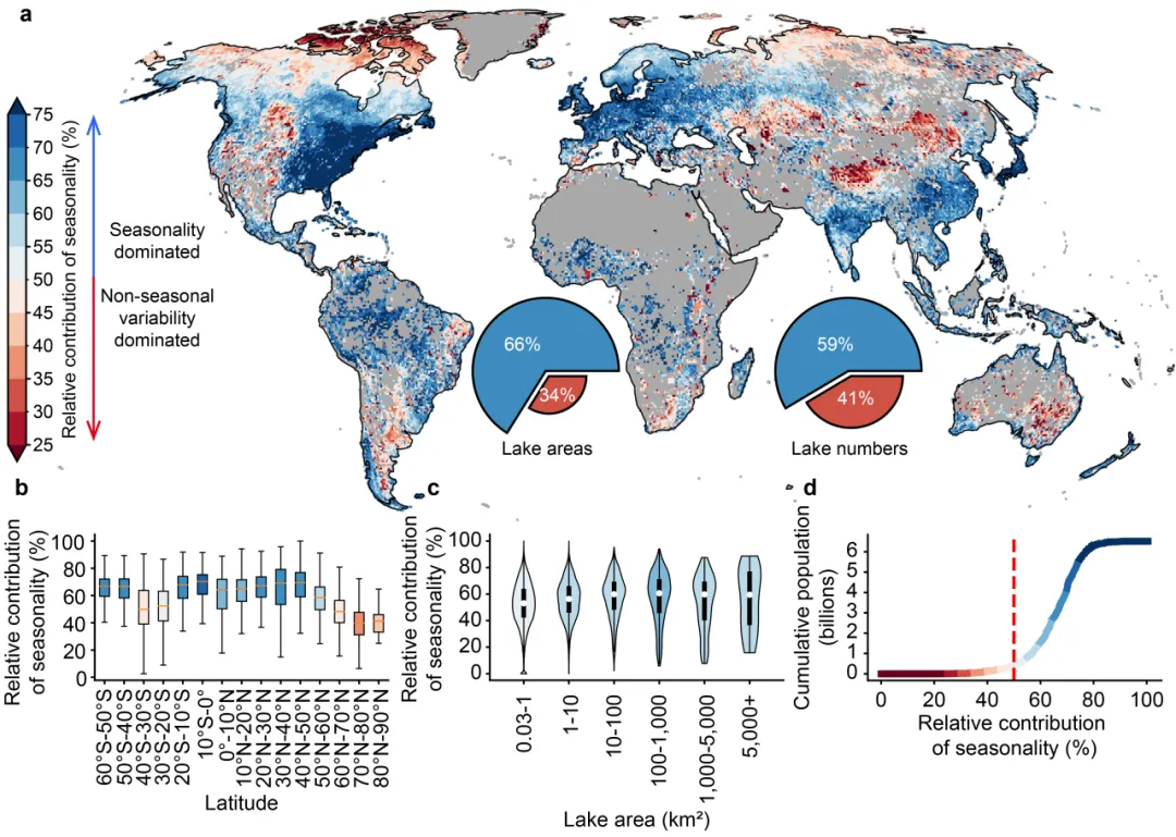 基于該數(shù)據(jù)集,研究團隊有了新發(fā)現(xiàn):研究顯示,全球66%的湖泊總面積和60%的湖泊數(shù)量,其水域面積動態(tài)都以季節(jié)性變化為主導。更為重要的是,這一季節(jié)性主導的分布格局與全球人口分布之間存在高度耦合關(guān)系——全球90%以上的人口,都居住在以季節(jié)性主導湖泊為主的流域。