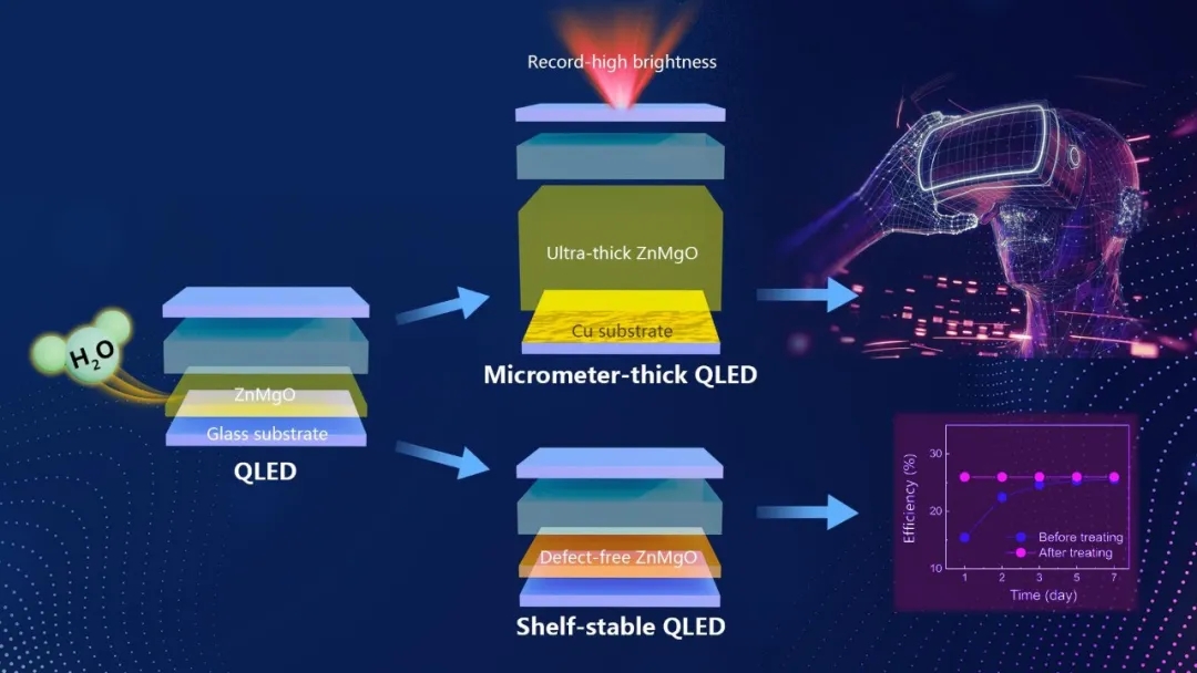 研究提出了水處理ZnMgO電子輸運層的新方法,有效鈍化了ZnMgO的缺陷,并顯著提高了ZnMgO的導電性,實現(xiàn)了微米級厚度及發(fā)光穩(wěn)定的高性能QLED。