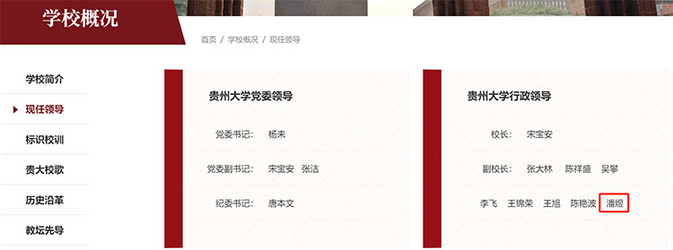 近日,據(jù)貴州大學(xué)官網(wǎng)“現(xiàn)任領(lǐng)導(dǎo)”一欄更新顯示,潘煜已任貴州大學(xué)副校長(zhǎng)(掛職)。