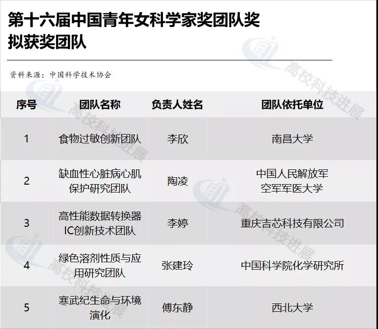 南昌大學、中國人民解放軍空軍軍醫(yī)大學和西北大學,各有1個團隊入圍第十六屆“中國青年女科學家獎團隊獎”擬獲獎團隊。擬獲獎團隊分別為:以南昌大學李欣教授為負責人的食物過敏創(chuàng)新團隊、以中國人民解放軍空軍軍醫(yī)大學陶凌教授為負責人的缺血性心臟病心肌保護研究團隊、以西北大學傅東靜為負責人的寒武紀生命與環(huán)境演化團隊。