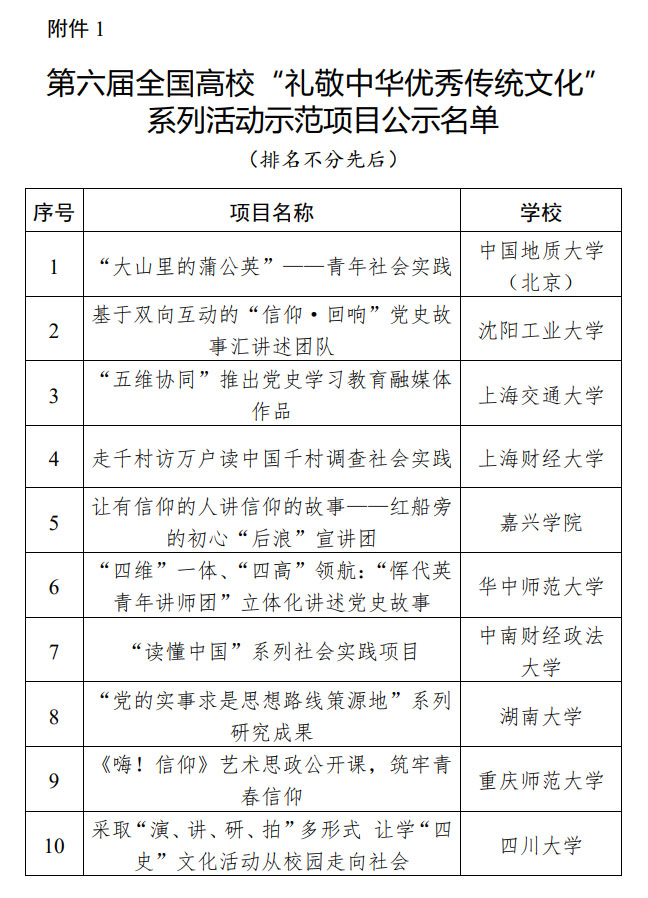 近日,教育部思想政治工作司公示了第六屆全國(guó)高?!岸Y敬中華優(yōu)秀傳統(tǒng)文化”系列活動(dòng)遴選結(jié)果。