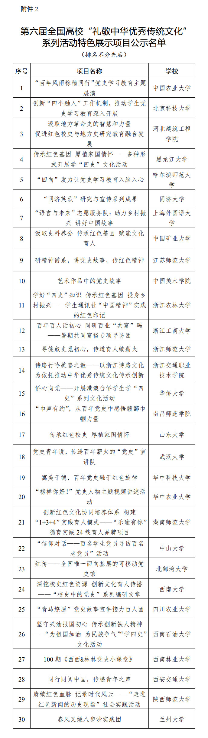 根據(jù)《教育部辦公廳關(guān)于開展第六屆全國(guó)高校“禮敬中華優(yōu)秀傳統(tǒng)文化”系列活動(dòng)的通知》(教思政廳函〔2021〕5號(hào))要求,經(jīng)高校自主申報(bào)、專家審核推薦等環(huán)節(jié),產(chǎn)生示范項(xiàng)目10項(xiàng)、特色展示項(xiàng)目30項(xiàng)。公示期為2022年9月26日至10月2日。