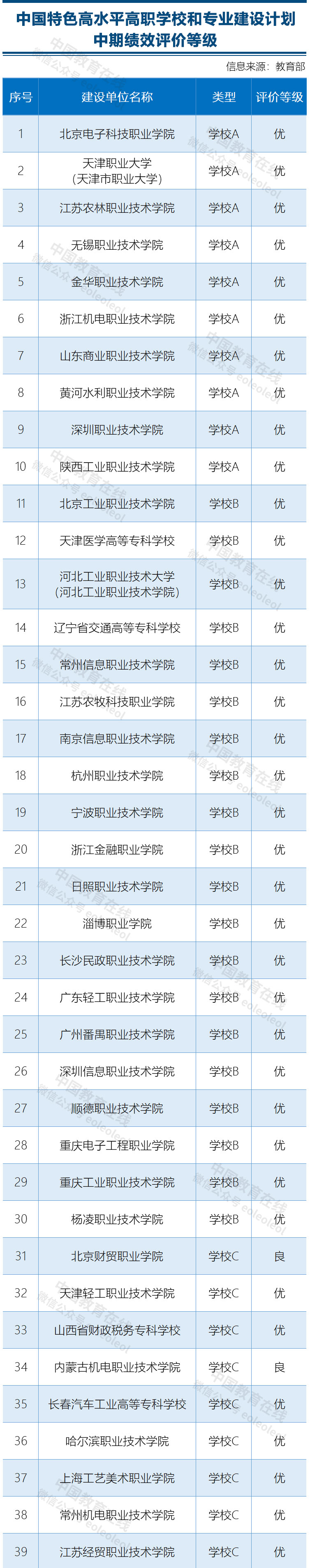 近日,教育部網(wǎng)站公布了中國特色高水平高職學(xué)校和專業(yè)建設(shè)計(jì)劃中期績(jī)效評(píng)價(jià)結(jié)果。根據(jù)《教育部辦公廳 財(cái)政部辦公廳關(guān)于開展中國特色高水平高職學(xué)校和專業(yè)建設(shè)計(jì)劃中期績(jī)效評(píng)價(jià)工作的通知》(教職成廳函〔2022〕10號(hào))要求,經(jīng)綜合評(píng)議、審核公示,對(duì)中國特色高水平高職學(xué)校和專業(yè)建設(shè)計(jì)劃(簡(jiǎn)稱“雙高計(jì)劃”)中期績(jī)效評(píng)價(jià)結(jié)果予以公布。