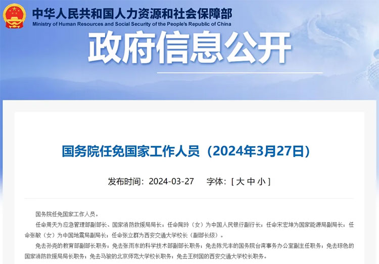 任命周天為應(yīng)急管理部副部長、國家消防救援局局長;任命陶玲(女)為中國人民銀行副行長;任命宋宏坤為國家能源局副局長;任命張敏(女)為中國地震局副局長;任命張立群為西安交通大學(xué)校長(副部長級)。