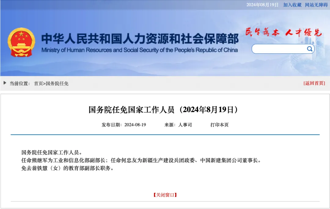 據(jù)人力資源和社會保障部網(wǎng)站8月19日消息,國務院任免國家工作人員: