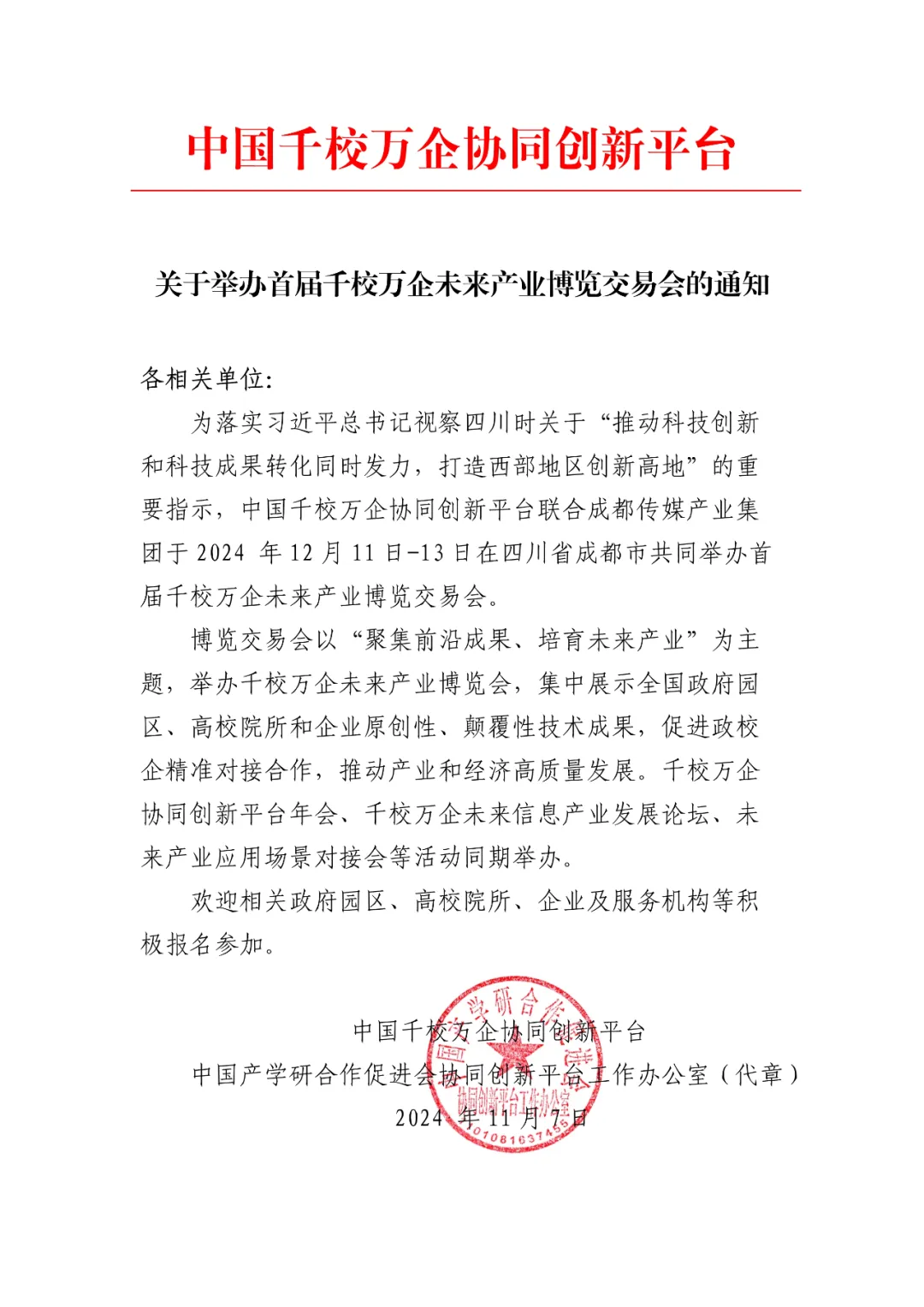 為落實(shí)習(xí)近平總書(shū)記視察四川時(shí)關(guān)于“推動(dòng)科技創(chuàng)新和科技成果轉(zhuǎn)化同時(shí)發(fā)力,打造西部地區(qū)創(chuàng)新高地”的重要指示,中國(guó)千校萬(wàn)企協(xié)同創(chuàng)新平臺(tái)聯(lián)合成都傳媒產(chǎn)業(yè)集團(tuán)于2024年12月11日-13日在四川省成都市共同舉辦首屆千校萬(wàn)企未來(lái)產(chǎn)業(yè)博覽交易會(huì)。