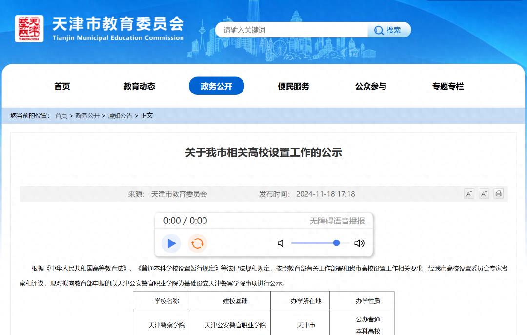 日前,天津市教委網(wǎng)站發(fā)布《關(guān)于我市相關(guān)高校設(shè)置工作的公示》,天津擬申報一所公安本科院校——天津警察學(xué)院,該校以天津公安警官職業(yè)學(xué)院為基礎(chǔ)。