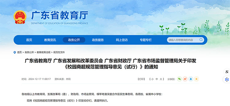 近日,廣東省教育廳等四部門發(fā)布《校園商超規(guī)范管理指導(dǎo)意見(試行)》。明確提出,中小學(xué)、幼兒園一般不得在校內(nèi)設(shè)置校園商超,已經(jīng)設(shè)置的,要逐步退出。寄宿制中小學(xué)可根據(jù)學(xué)校實(shí)際需求,征求家委會(huì)和學(xué)生代表意見后,經(jīng)學(xué)校領(lǐng)導(dǎo)班子、校代會(huì)或教代會(huì)等方式集體討論后決定。