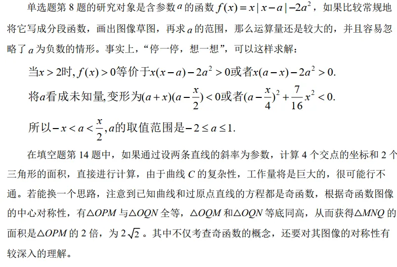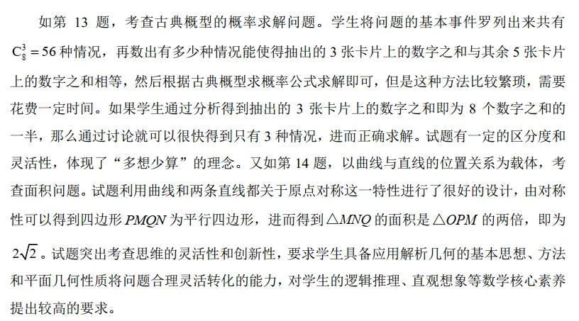 未來的高考要區(qū)分出真正具備數(shù)學(xué)素養(yǎng)、思維能力強(qiáng)的學(xué)生,而不是靠熟練度只會(huì)做套路題目的學(xué)生。測試卷表明,考生應(yīng)該改變原有的應(yīng)考觀念,走出“多刷題、算得快”的誤區(qū)。也可以看出,通過選擇行之有效的方法簡化計(jì)算,讓考生能夠有充分的時(shí)間進(jìn)行思考,仍然是今后高考數(shù)學(xué)將堅(jiān)持的改革方向。