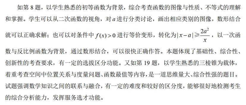 測試卷符合“依標(biāo)命題、源于教材”的命題理念,強(qiáng)化與課標(biāo)、教材的銜接,引導(dǎo)一線教學(xué)回歸課標(biāo)、回歸課堂主渠道,引導(dǎo)一線教學(xué)講透教材內(nèi)容,注重減量提質(zhì),與高中數(shù)學(xué)教學(xué)同向同行、同頻共振,對數(shù)學(xué)高考改革又做了一次有益的嘗試,對教育評價(jià)具有積極的導(dǎo)向作用。