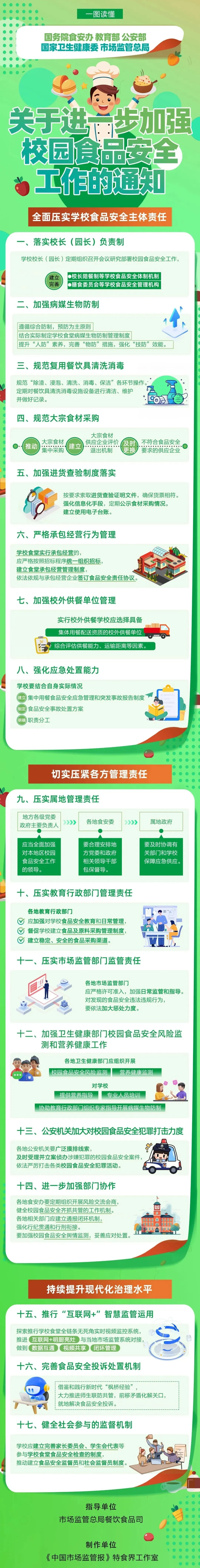 《通知》強調(diào),地方各級黨委和政府主要負責(zé)人應(yīng)當全面加強對本地區(qū)校園食品安全工作的領(lǐng)導(dǎo)。各地食安辦、教育行政部門、衛(wèi)生健康部門、公安機關(guān)、市場監(jiān)管部門要依職責(zé)加強校園食品安全工作,強化部門協(xié)作,定期組織開展風(fēng)險交流會商,健全校園食品安全齊抓共管的工作機制。