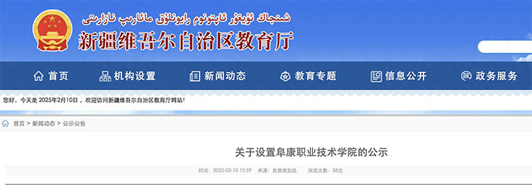 2月10日,新疆維吾爾自治區(qū)教育廳發(fā)布“關于設置阜康職業(yè)技術學院的公示”。