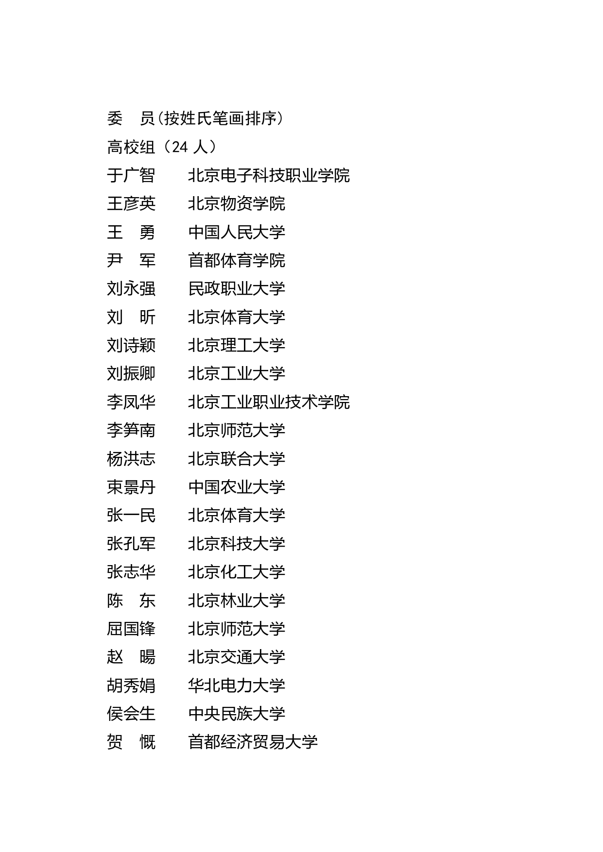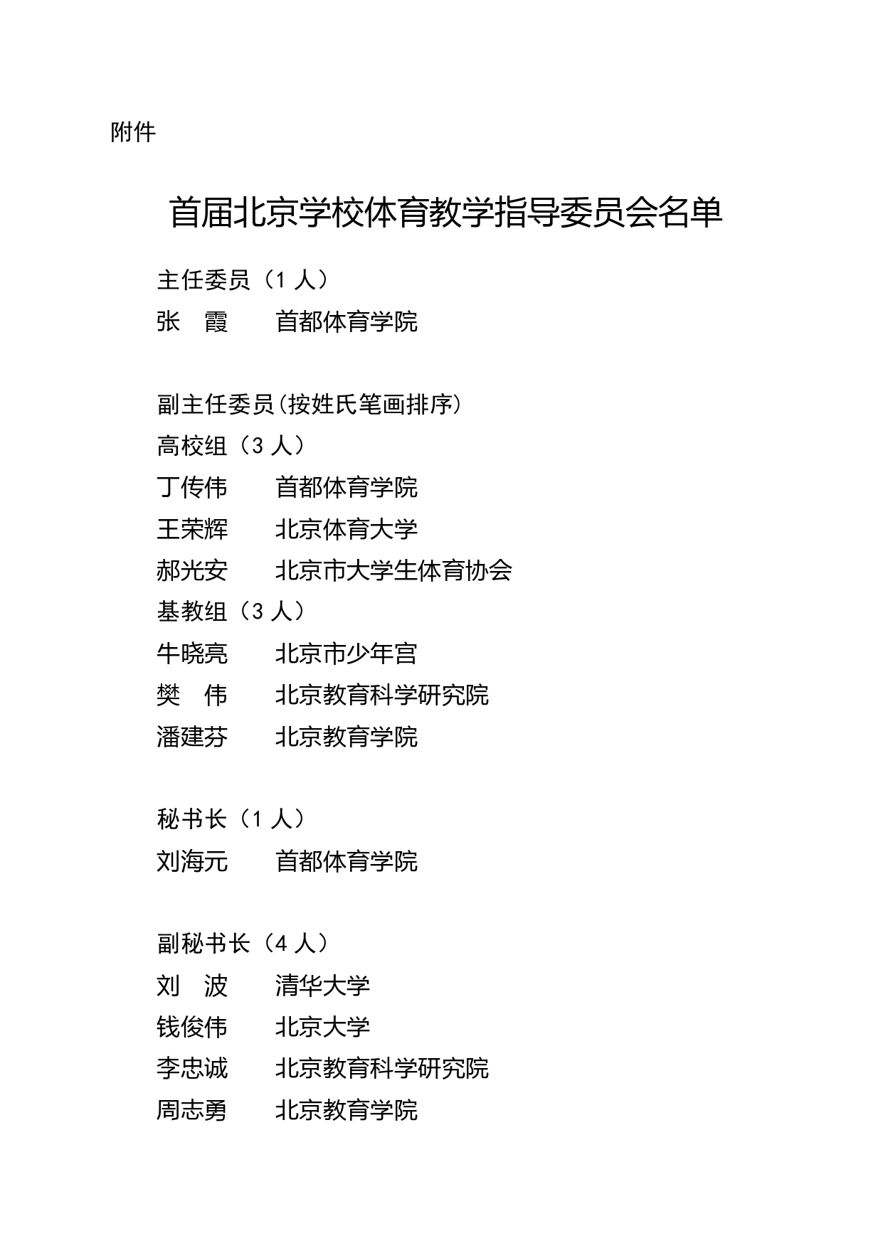 首屆北京學校體育教學指導委員會有委員63人,包括主任委員1人、副主任委員6人、秘書長1人、副秘書長4人、委員51人。委員聘期4年,自2025年1月起至2028年12月止。委員會分為高校組和基教組,按照專業(yè)領(lǐng)域分為理論研究、教育教學、賽事活動三個方向。教指委秘書處設(shè)在首都體育學院。