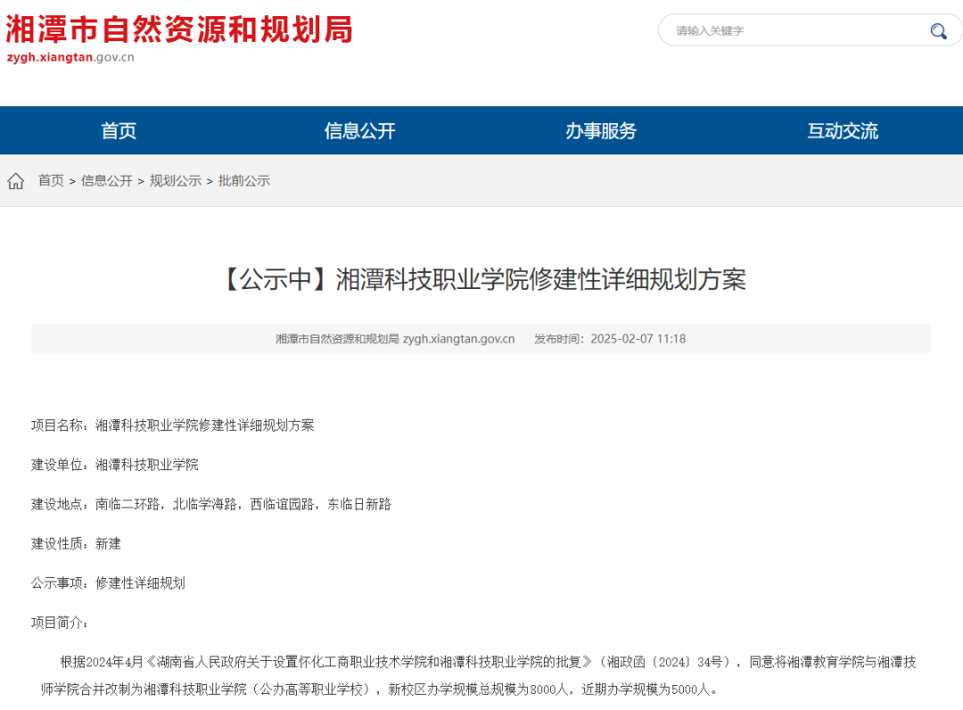 2月7日,湘潭市自然資源和規(guī)劃局公示湘潭科技職業(yè)學院修建性詳細規(guī)劃方案。根據2024年4月《湖南省人民政府關于設置懷化工商職業(yè)技術學院和湘潭科技職業(yè)學院的批復》,同意將湘潭教育學院與湘潭技師學院合并改制為湘潭科技職業(yè)學院(公辦高等職業(yè)學校),新校區(qū)辦學規(guī)??傄?guī)模為8000人,近期辦學規(guī)模為5000人。