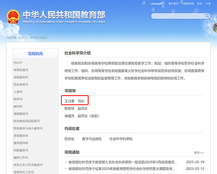 日前,教育部官網(wǎng)顯示,王日春出任教育部社會(huì)科學(xué)司司長(zhǎng),原社科司司長(zhǎng)徐青森現(xiàn)任教育部黨組成員、副部長(zhǎng)。