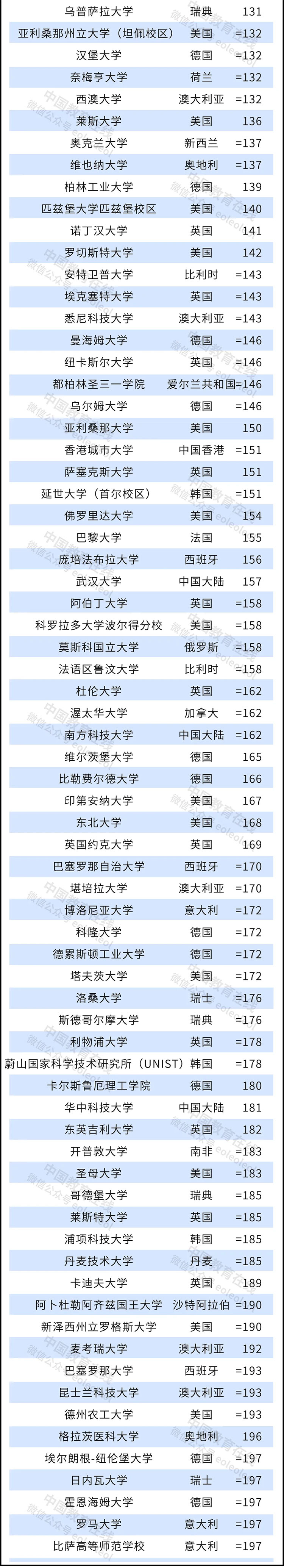 武漢大學(xué)(第 157 名)、南方科技大學(xué)(第 162名)和華中科技大學(xué)(第 181 名)為首次進(jìn)入前200名的高校。