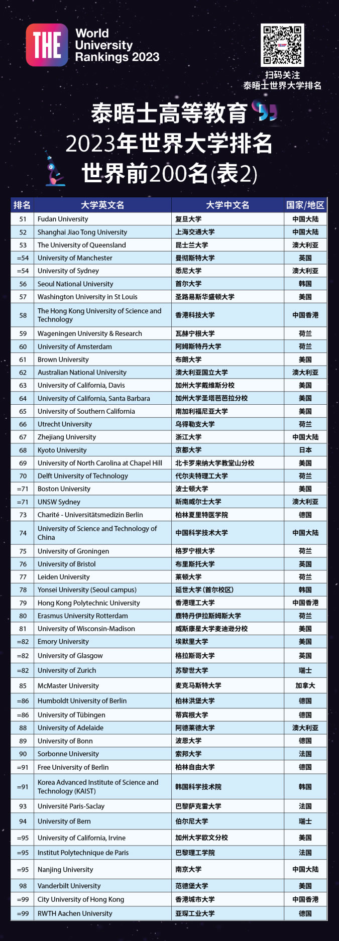 復旦大學(第51位)以及上海交通大學(第52位)排名均有所上升,進一步逼近世界50強。