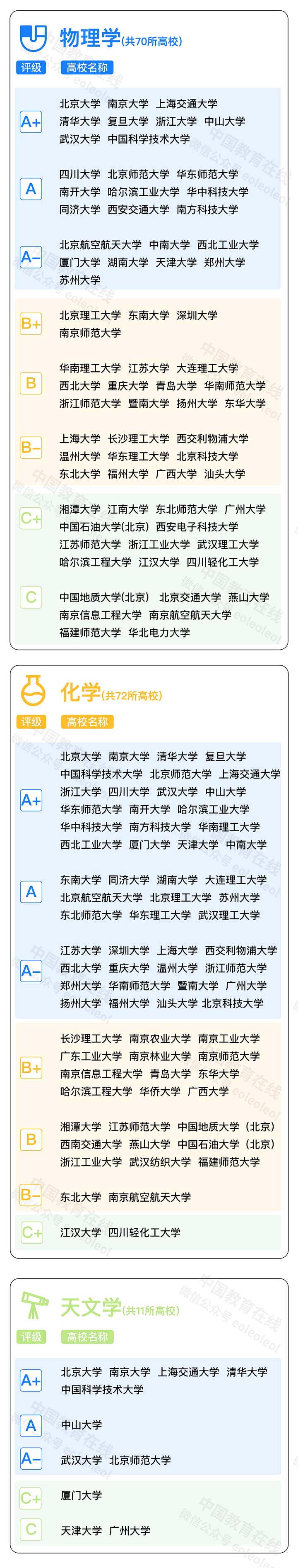 中國大陸有5所高校的天文學(xué)評級達(dá)到A+,分別為北京大學(xué)、南京大學(xué)、上海交通大學(xué)、清華大學(xué)和中國科學(xué)技術(shù)大學(xué)。總體而言,有21所中國大陸高校在至少一門理學(xué)學(xué)科中獲得A+評級。