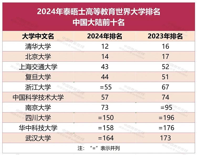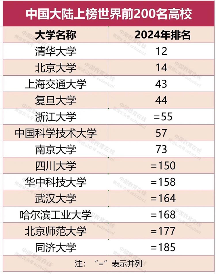 本屆排名,中國(guó)大陸有兩所大學(xué)進(jìn)入前20名,7所大學(xué)進(jìn)入前100名,13所大學(xué)進(jìn)入前200名。在六年前發(fā)布的2018年世界大學(xué)排名中,中國(guó)大陸僅有兩所大學(xué)進(jìn)入前100名。在過(guò)去的五年中,中國(guó)大陸高校在世界范圍內(nèi)進(jìn)步最大,總平均分從2020年的35.5分上升到2024年的48.9分。