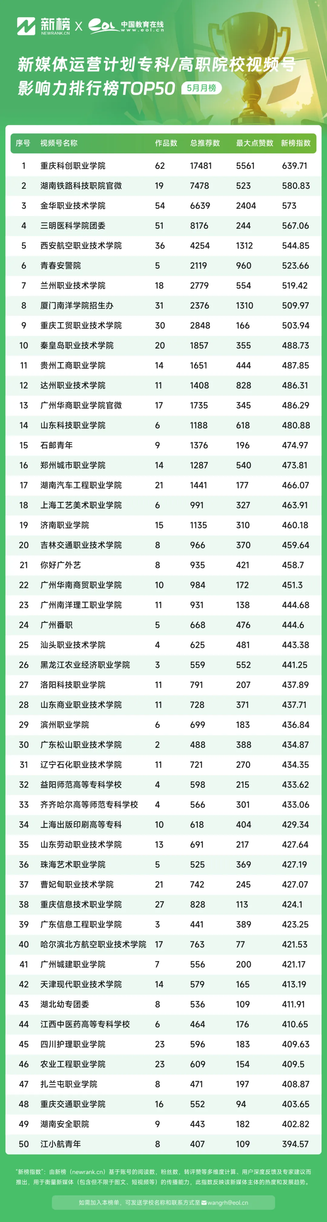 5月,中國教育在線新媒體運營計劃高職??圃盒R曨l號影響力排行榜TOP50中,@重慶科創(chuàng)職業(yè)學(xué)院視頻號憑借639.71的新榜指數(shù)躍居榜單第一,@湖南鐵路科技職院官微憑借580.83的影響力指數(shù)位居第二,@金華職業(yè)技術(shù)學(xué)院以573的影響力指數(shù)位居榜單第三。