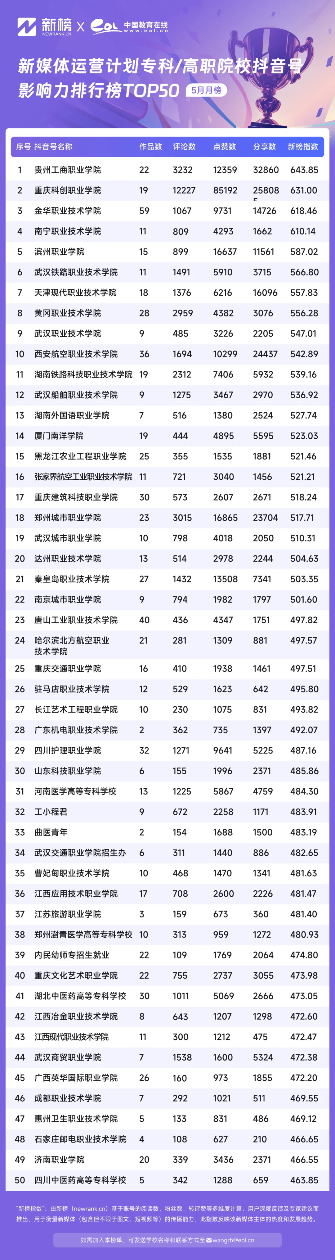 5月,中國教育在線新媒體運營計劃高職??圃盒6兑粲绊懥ε判邪馮OP50中,@貴州工商職業(yè)學(xué)院抖音號憑借643.85的新榜指數(shù)躍居榜單第一,@重慶科創(chuàng)職業(yè)學(xué)院憑借631.00的影響力指數(shù)位居第二,@金華職業(yè)技術(shù)學(xué)院以618.46的影響力指數(shù)位居榜單第三。