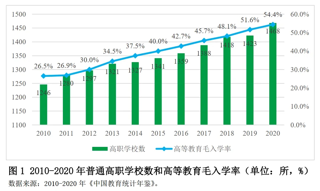 第一,我國高等職業(yè)教育仍處于規(guī)模擴(kuò)張階段。高職學(xué)校數(shù)量從2010年的1246所增加到2020年的1468所,十年間增長了17.82%。高職在校學(xué)生數(shù)十年間增長了32.55%。高職教育經(jīng)費(fèi)投入逐年增長,生均教育經(jīng)費(fèi)投入高于2.2萬元。