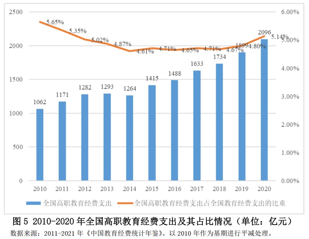在高等職業(yè)教育經(jīng)費(fèi)收入增長的背景下,教育經(jīng)費(fèi)支出也穩(wěn)步提升。自2010年以來,我國高等職業(yè)教育經(jīng)費(fèi)支出不斷增長(見圖5),從2010年的約1062億元,上升到2016年的約1488億元,再增長到2020年的約2096億元,增加了約97%。此外,在此期間,我國高職教育經(jīng)費(fèi)支出占全國教育經(jīng)費(fèi)總支出的比重經(jīng)歷了先下降后上升的趨勢,從2010年的5.65%下降至2014年的4.71%,隨后穩(wěn)定在4.7%左右,2020年增加到5.14%,與高職經(jīng)費(fèi)收入占比一致。