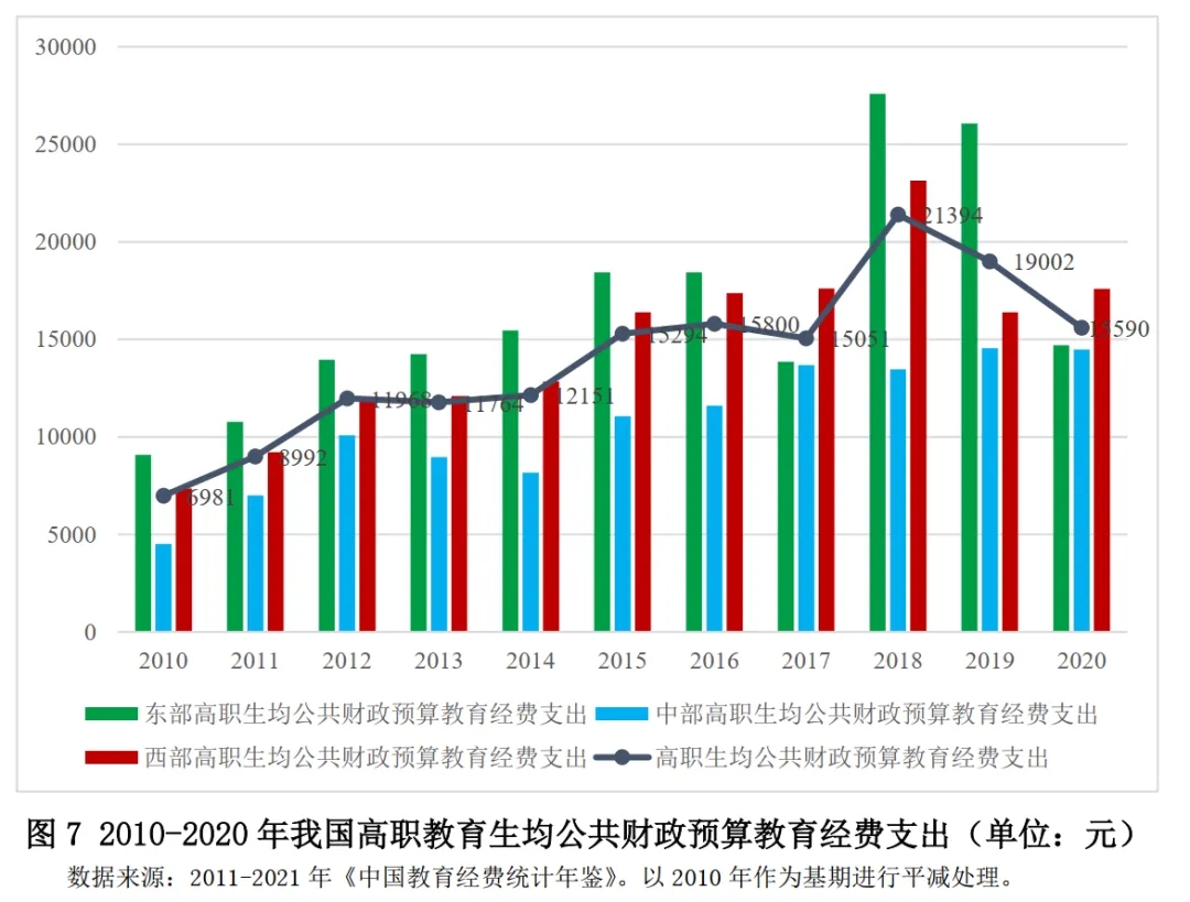 2010—2020年,全國高職生均教育經(jīng)費(fèi)支出呈現(xiàn)上升趨勢,從2010年的14081元到2016年的23016元,再到2020年的29255元,增加了約108%。地區(qū)間差異明顯,呈現(xiàn)中部塌陷現(xiàn)象。東部地區(qū)生均教育經(jīng)費(fèi)水平高于西部和中部,2020年達(dá)到33071元(見圖6)。在生均教育經(jīng)費(fèi)中,生均公共財政預(yù)算教育經(jīng)費(fèi)總體增長,2015年全國均值超過15000元,2020年達(dá)到15590元。從地區(qū)差異來看,東部地區(qū)的生均公共財政預(yù)算教育經(jīng)費(fèi)水平同樣高于西部和中部。(圖7)(注:東部地區(qū)包括北京、天津、河北、上海、江蘇、浙江、福建、山東、廣東、海南、遼寧;中部地區(qū)包括:山西、安徽、江西、河南、湖北、湖南、吉林和黑龍江;西部地區(qū)包括:內(nèi)蒙古、廣西、重慶、四川、貴州、云南、西藏、陜西、甘肅、青海、寧夏和新疆)