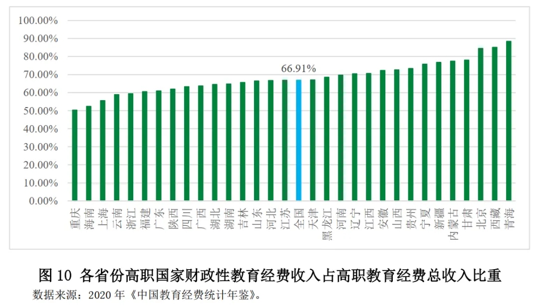 2019年,我國高職院校的國家財政性教育經(jīng)費(fèi)占高職教育經(jīng)費(fèi)總收入比例的中位數(shù)為66.9%,大部分省份的比例處于60%—80%區(qū)間。北京、西藏和青海的這一比例相對較高,均超過85%,而重慶、海南、上海、云南、浙江的這一比例相對較低,均低于60%。(圖10)總體而言,國家財政性教育經(jīng)費(fèi)投入已成為各省份高等職業(yè)院校的主要經(jīng)費(fèi)收入來源。