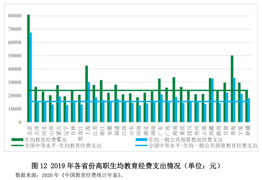圖12反映了2019年各省份高職生均教育經(jīng)費(fèi)支出情況及各省份之間的差異。整體而言,各省份的高職生均教育經(jīng)費(fèi)支出情況與生均一般公共預(yù)算教育經(jīng)費(fèi)支出情況類似,北京、青海、上海、西藏四個省份均位居前列,而黑龍江、山西、遼寧、河南四個省份均墊底。