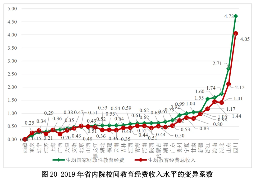 從2019年各省份生均教育經(jīng)費(fèi)收入和生均財政性教育經(jīng)費(fèi)收入的變異系數(shù)來看:(1)西藏、重慶、遼寧、江蘇的省內(nèi)均衡性位居前列,變異系數(shù)小于0.4;(2)四川、山東、河北和海南位居最末,變異系數(shù)大于1.0。山東和四川兩個指標(biāo)的變異系數(shù)大于2.0,遠(yuǎn)高于省際間同類指標(biāo)的變異系數(shù)。除了少數(shù)例外,各省份的生均財政性教育經(jīng)費(fèi)收入變異系數(shù)均大于生均教育經(jīng)費(fèi)總收入的變異系數(shù),這表明財政性投入沒有縮小省內(nèi)院校間的收入差距。(圖20)